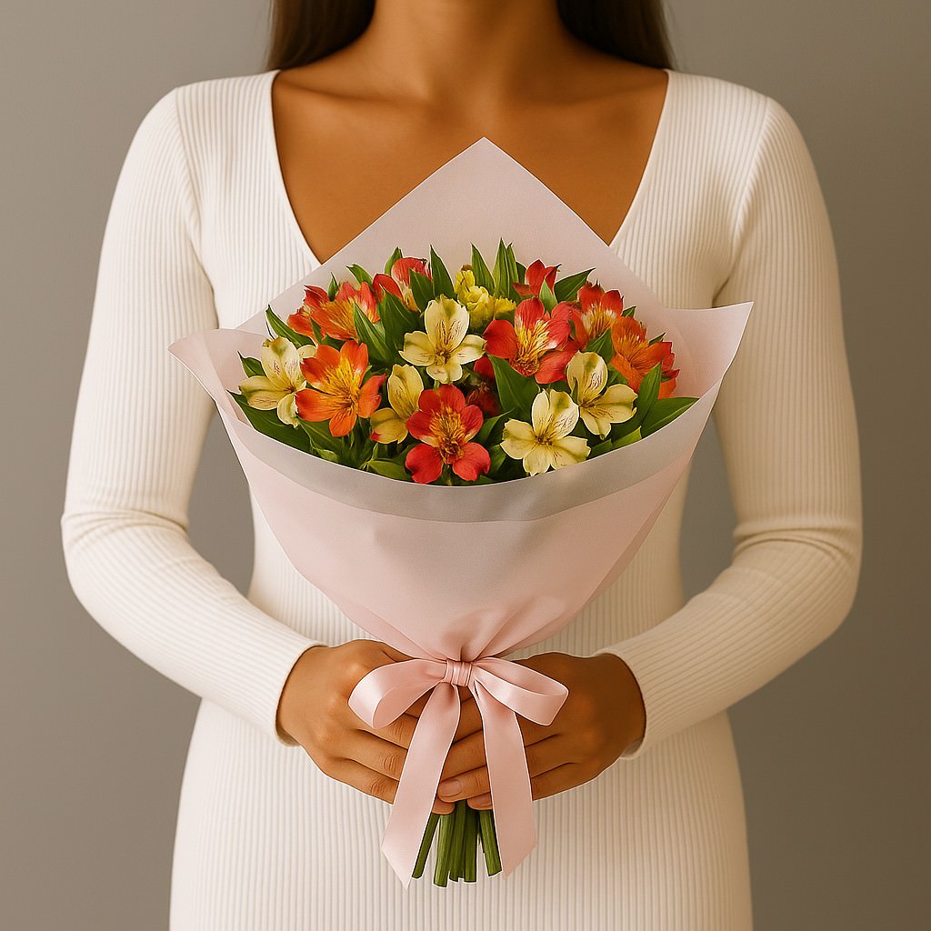 Очаровательный букет из разноцветных альстромерий, оформленный в нежную розовую упаковку и перевязанный атласной лентой. Яркие оттенки цветов создают атмосферу радости и свежести, делая композицию универсальным подарком.