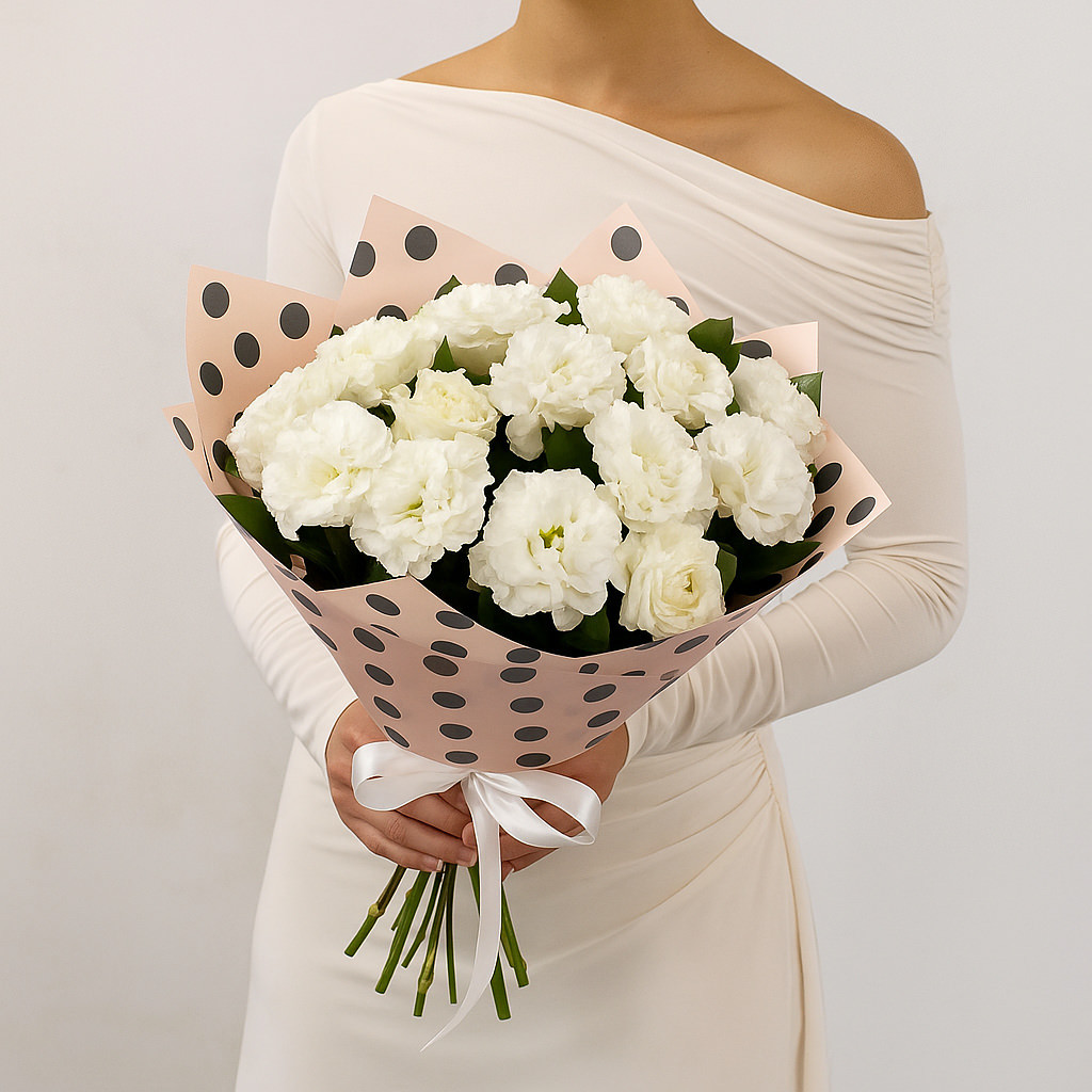 Изысканный букет, который станет символом чистоты и искренности. Белоснежные эустомы и розы в нежной упаковке создают лёгкий и утончённый образ, подходящий для самых трогательных моментов.