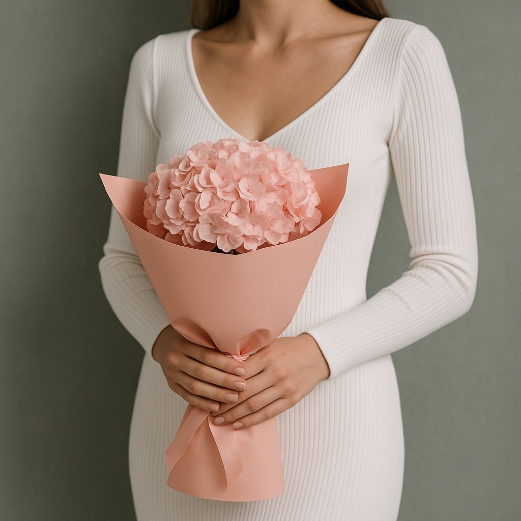 Изысканный и утончённый букет из одной крупной шапки гортензии в нежно-розовом оттенке. Лёгкая упаковка в пастельно-персиковом цвете подчёркивает воздушность композиции и делает её элегантным подарком для любого повода.