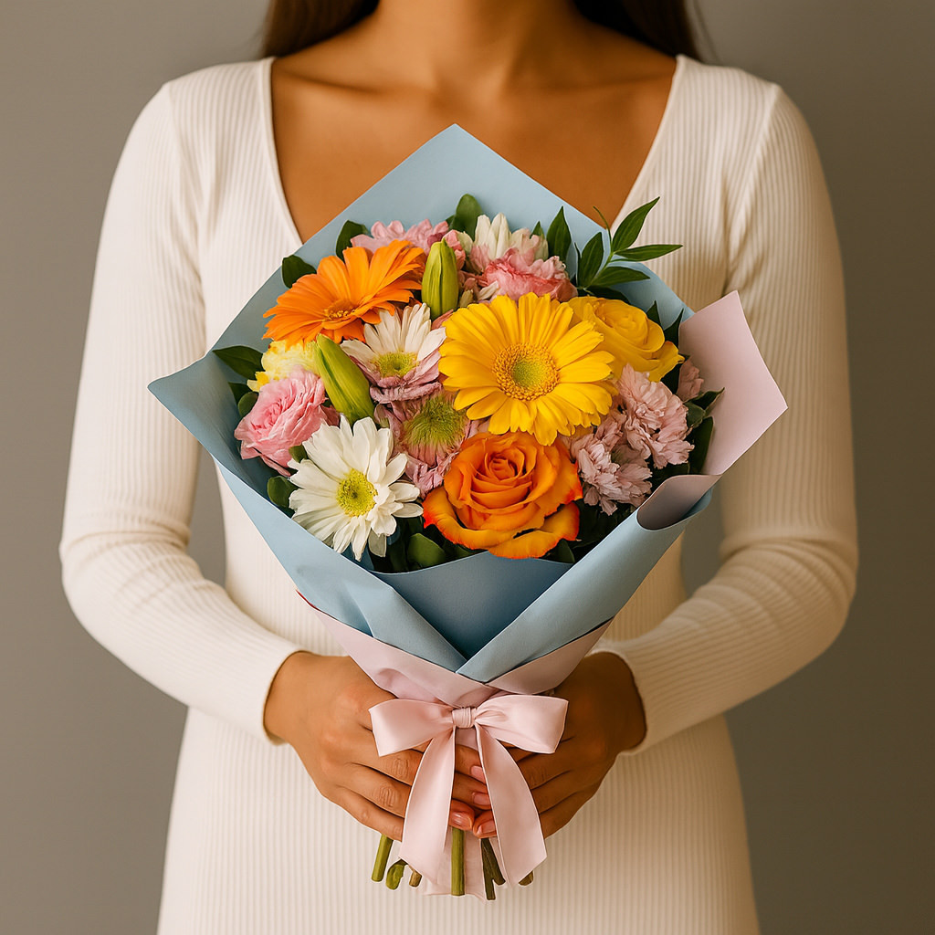 Яркий и одновременно утончённый букет, в котором солнечные герберы, нежные розы и лёгкие хризантемы гармонично сочетаются с лилиями и декоративной зеленью. Упаковка в пастельных тонах подчёркивает свежесть и изысканность композиции.