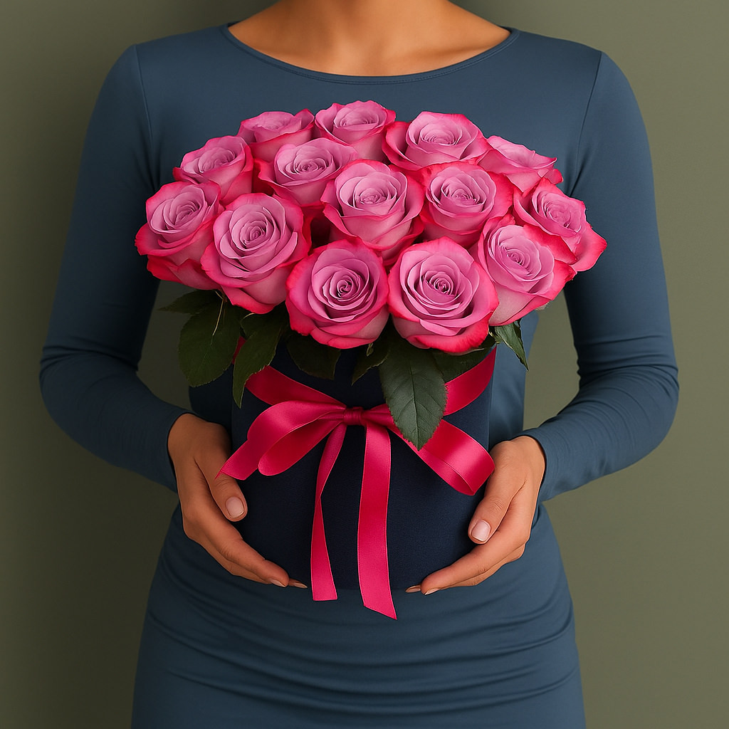 Яркая композиция из роз с сиреневыми бутонами и малиновой каймой – стильный подарок для ценителей утончённых деталей.