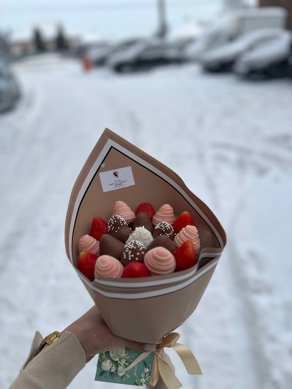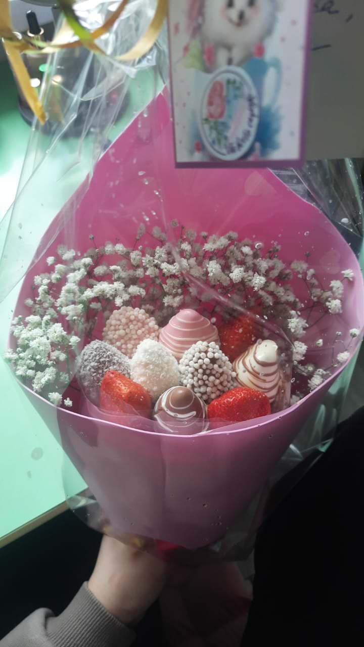 Отличная работа! 👍 Заказала дочери букет из клубники, осталась в полном восторге 😍. Сделали всё так, как попросила. Спасибо огромное! Рекомендую! 👍 🔥💕